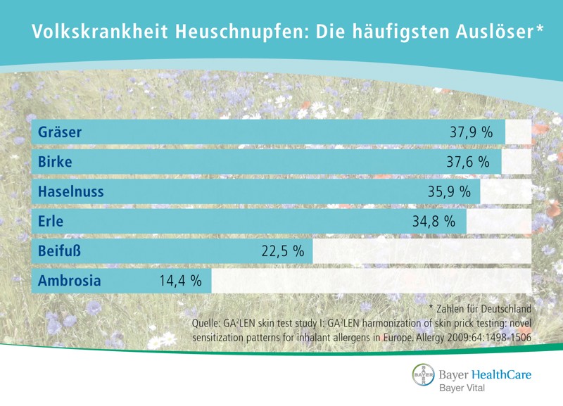 Die Menschen freuen sich nach dem langen und kalten Winter auf den Frühling. Für Millionen Pollenallergiker beginnt mit der warmen Jahreszeit jedoch eine Leidensphase. Die meisten Allergiker reagieren auf früh blühende Bäume und Sträucher wie Haselnuss, Erle oder Birke. Aber auch Gräser-, und Getreidepollen sind für viele Betroffene eine Qual. Viele Allergiker reagieren auf mehrere Pollenarten mit verschiedenen Blühzeiten, das bedeutet: durchgängige Heuschnupfen-Saison von Februar bis Oktober.
